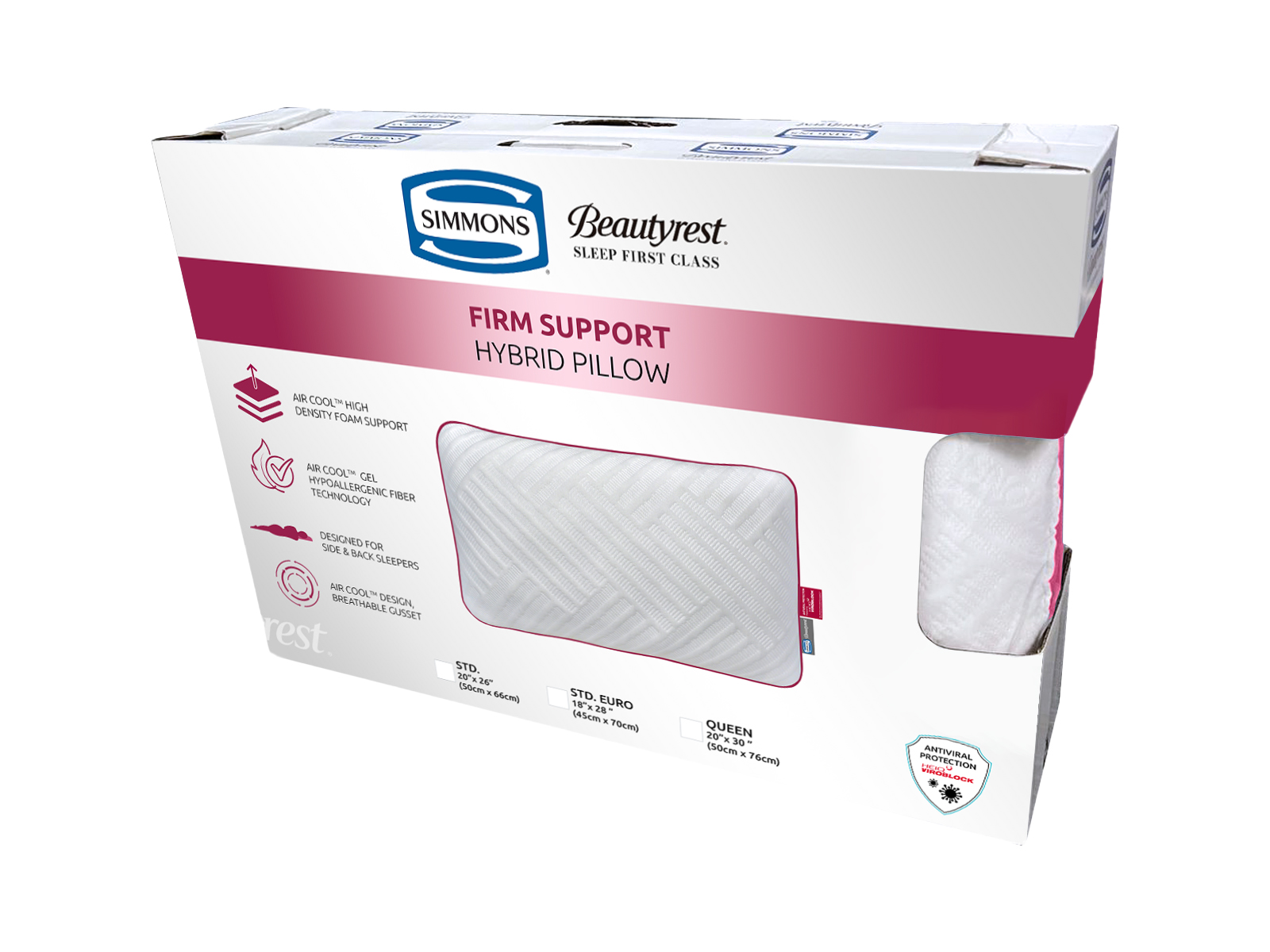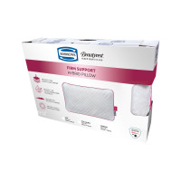 Su combinación de fibras Down Alternative (pluma sintética) y un núcleo central de espuma HR de alto soporte que ofrece soporte al cuello y nuca. Cuenta con una funda transpirable de tejido circular con distintivos logos Simmons, además de un pliegue lateral que le proporciona mayor volumen. Su innovador panel lateral en tela 3D transpirable favorece la circulación del aire, manteniendo una temperatura óptima durante toda la noche.