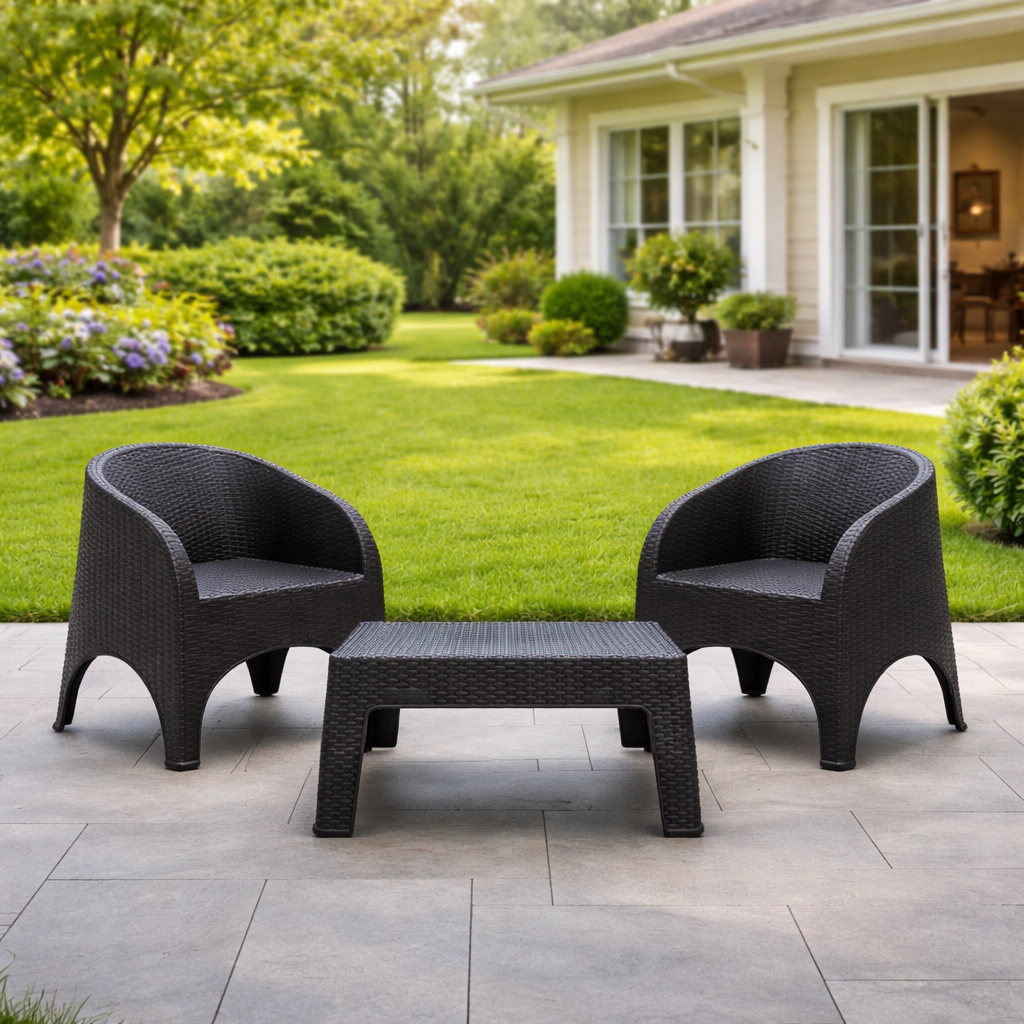 Renueva tus espacios con el práctico y moderno Juego de Sala Bistro, diseñado especialmente para áreas pequeñas sin sacrificar estilo ni comodidad. Su estructura liviana y ergonómica permite moverlo fácilmente entre interiores y exteriores, convirtiéndolo en la opción ideal para tu jardín, terraza o balcón. Gracias a su material resistente al clima, podrás disfrutarlo durante todo el año con total confianza.